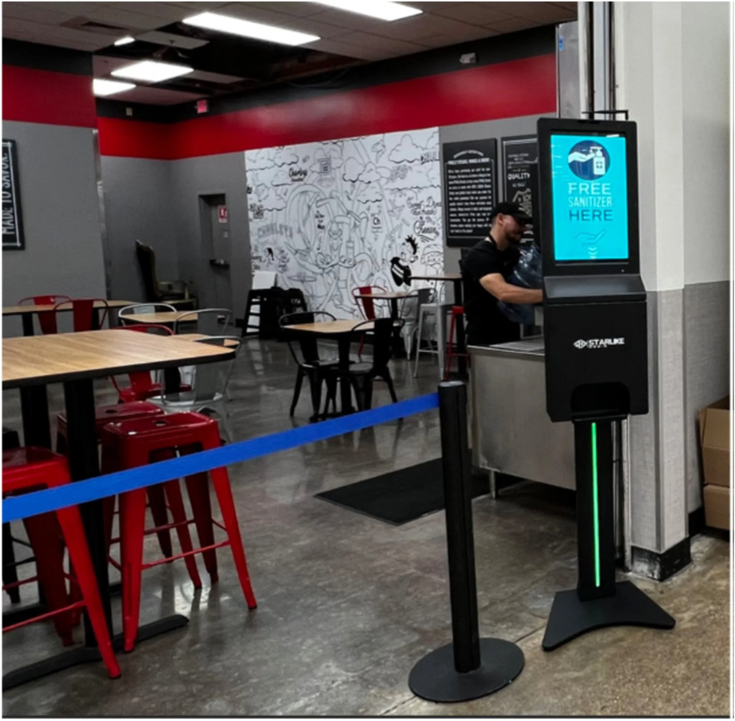 Automatic hand sanitizer station in the middle.